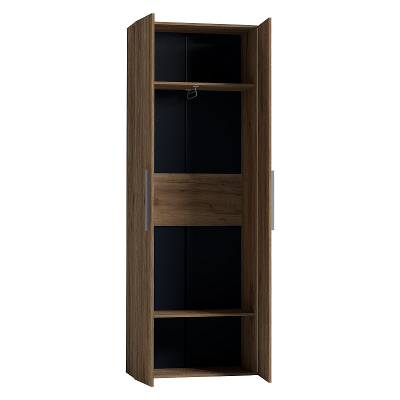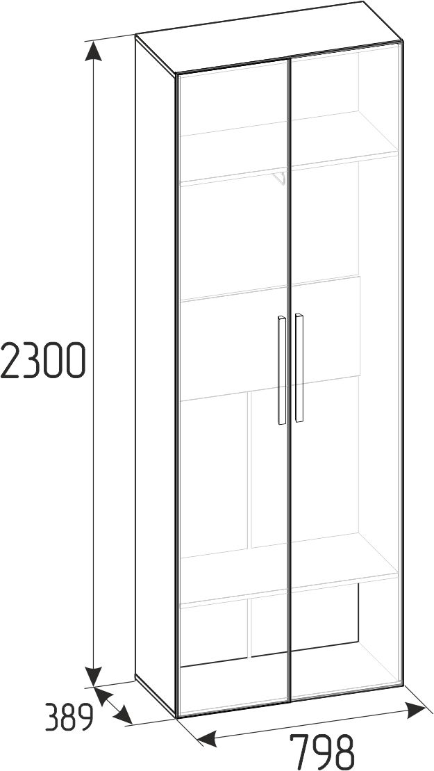 Двухдверный распашной шкаф легко открывается за ручку-петлю из микрофибры, которая устанавливается на одном зеркальном фасаде, другой - открывается за рамку. Шкаф комплектуется выдвижной штангой и двумя полками сверху и снизу. Регулируемые опоры компенсируют неровности пола.
