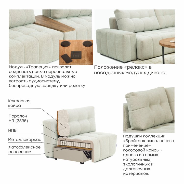 Модульная коллекция «Брайтон» — это сочетание технологий и минимализма. Особенностью коллекции является положение RELAX, которое увеличивает глубину сиденья на 30%. Подушки изготовлены из кокосовой койры — одного из самых экологичных и долговечных материалов. Благодаря своей специальной форме, они идеально подстраиваются под изгибы тела, усиливая эффект от положения RELAX.