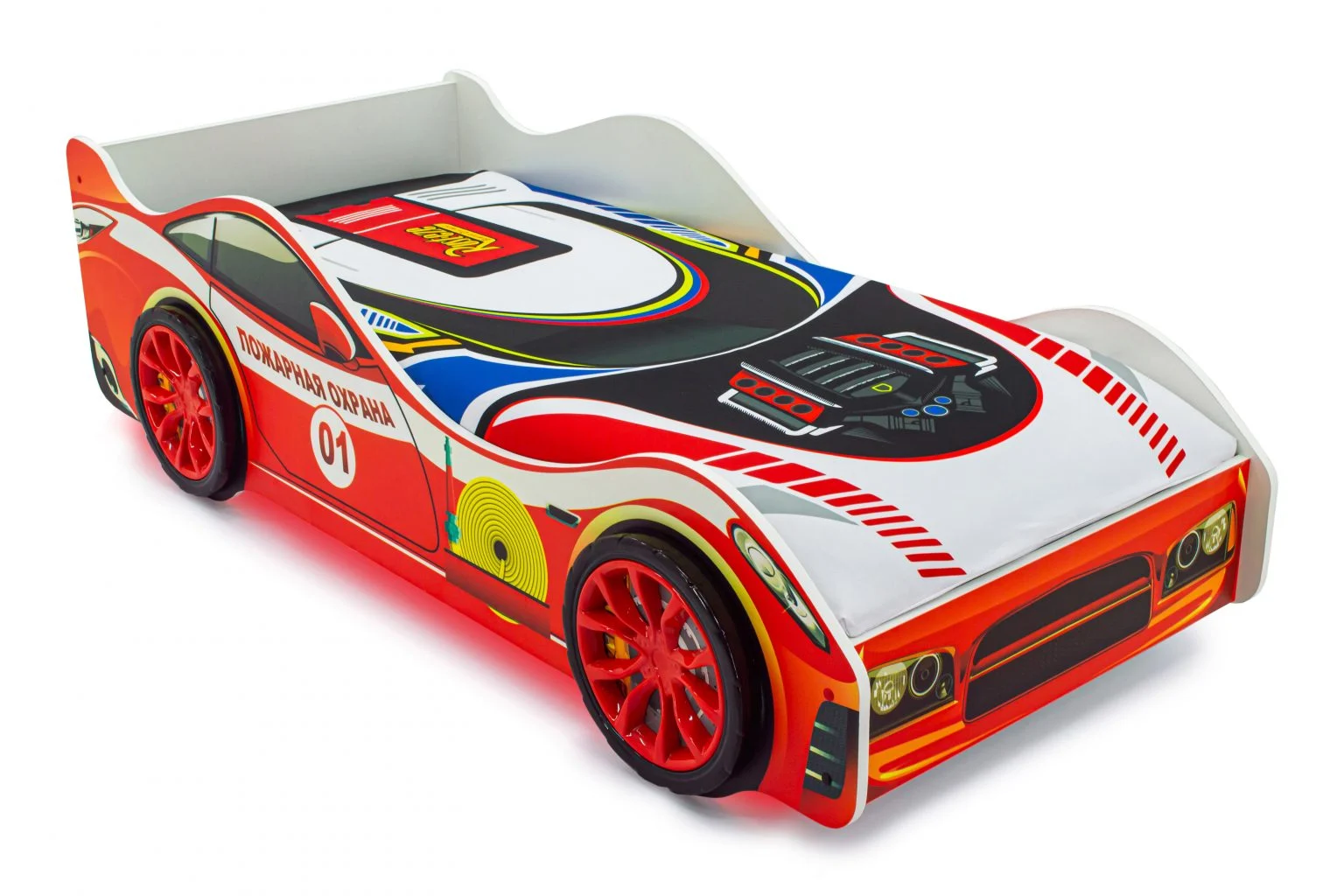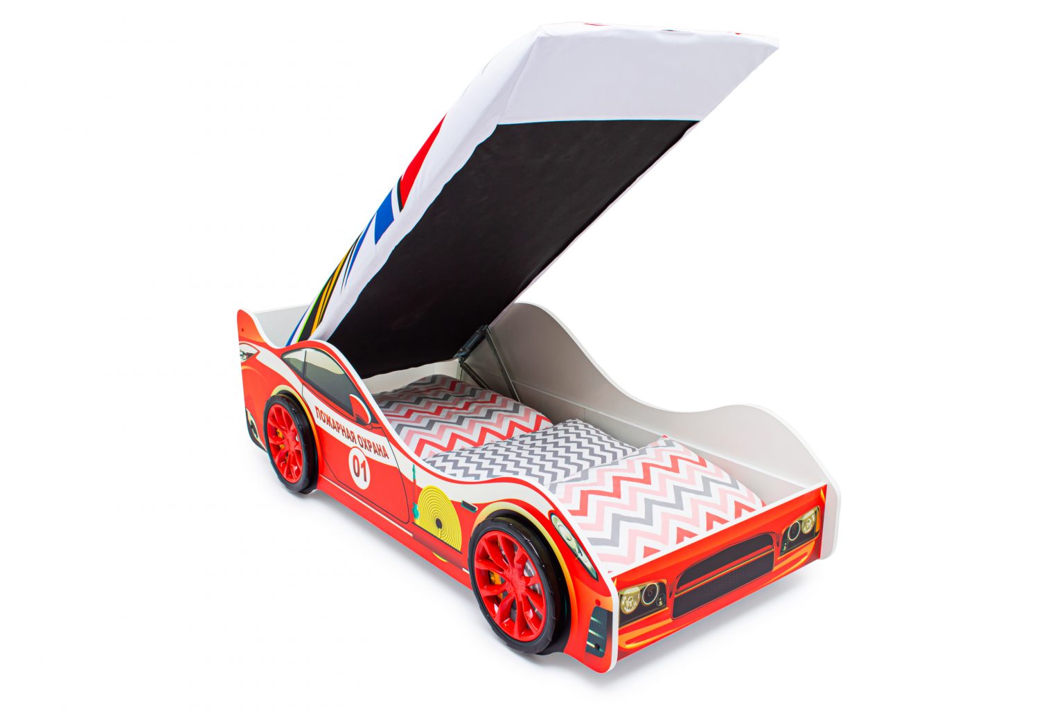 Детская кровать-машина “Пожарная охрана” с подъемным механизмом станет любимым местом для сна и игр мальчика или девочки от 2 до 10-12 лет.
