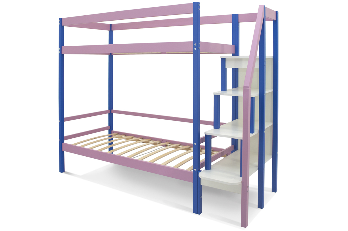 Кровать оборудована практичной лестницей-стеллажом. Полки лестницы можно использовать для игрушек, книг, ночника. Лестницу легко зафиксировать как справа, так и слева от кровати, что очень удобно. На каждом ярусе установлено прочное ортопедическое основание из 12 лат. Спальное место выдерживает нагрузку до 200 кг.