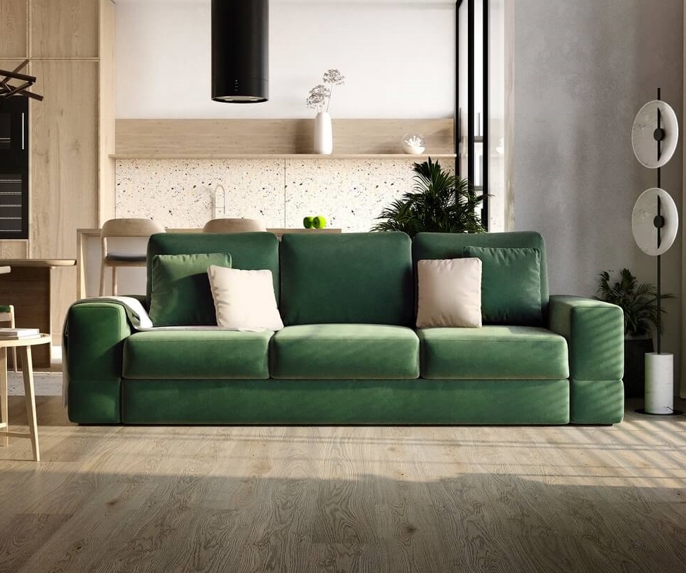 Диван имеет систему трансформации «тик-так». Так же диван укомплектован тремя большими подушками в единой ткани с диваном. Состоит из дивана со спальным элементом и оттоманки. Имеет 2 вместительных короба для хранения