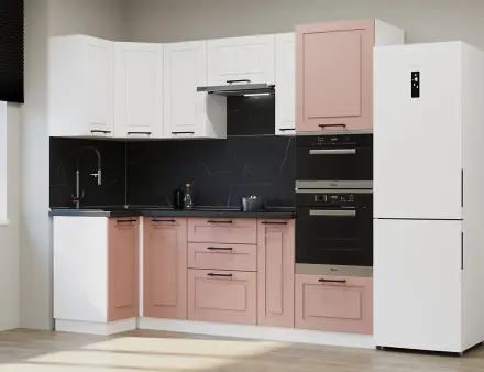 Аликанте 5: Цвет фасада: Шарли Pink, Шарли белый, корпус Серый, столешница 28мм: Каспий черное золото