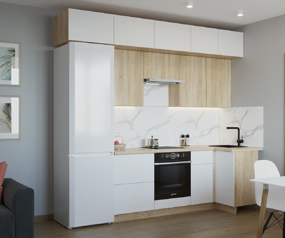 Матовые белые кухни — классика дизайна. Они практичны и универсальны, а сочетание с деревом идеально впишется в любой стиль: прованс, современная классика, минимализм.