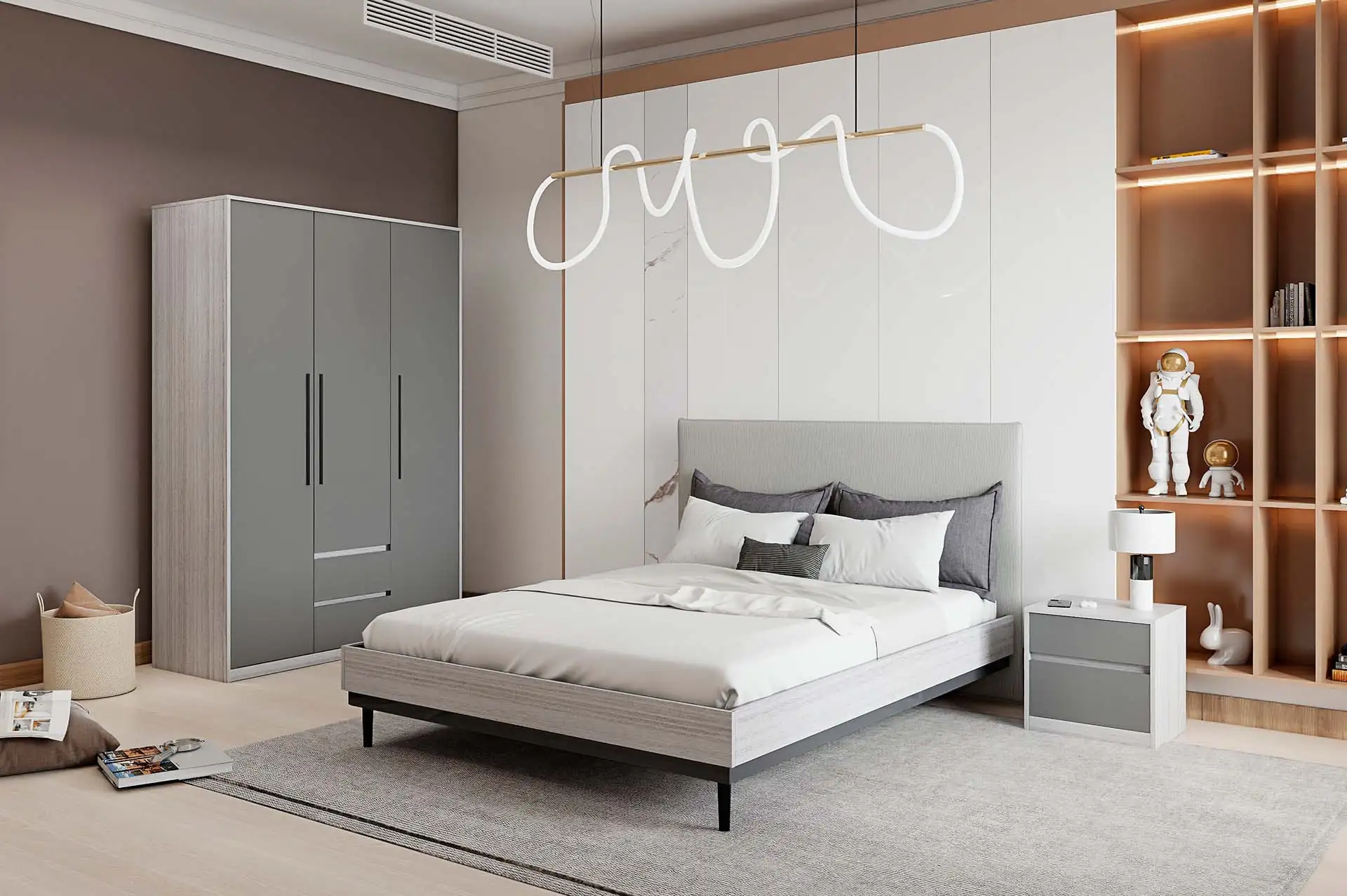 Прикроватная тумба идеально впишется в интерьер спальни в серии "Нильс" в трендовом сочетании графитового и фактурного белого.